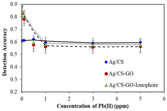 The detection accuracy for Ag/CS, Ag/CS-GO, and Ag/CS-GO-Ionophore nanostructure thin films toward different concentrations of Pb(II) ions.