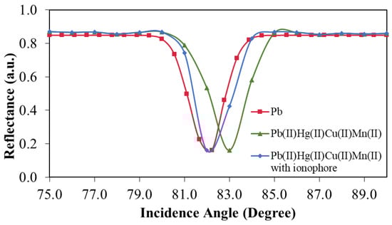 Figure 11 shows the selectivity of the Ag/CS-GO nanostructure thin film for Pb(II) ion detection at a concentration of 1 ppm. In this work, the pH values for all the metal solutions were controlled in the range of 6.0 to 6.5 to maintain good SPR response. When Ag/CS-GO was exposed to the single Pb(II) metal ion solution, the degree of incidence angle is at 82.22°. When the Ag/CS-GO thin film was exposed to the mixture of metal ion solution containing Pb(II), Hg(II), Cu(II), and Mn(II), the angle of incidence slightly shifted to the right at 83°. The slight shift in angle is probably due to the presence of interference in the solution. However, when ionophore was added into the solution, the angle of incidence was similar to that of the single Pb(II) metal ion solution which is at 82°, hence showing that the sensor selectivity is enhanced through the addition of ionophore and shows good selectivity toward Pb(II) ions.