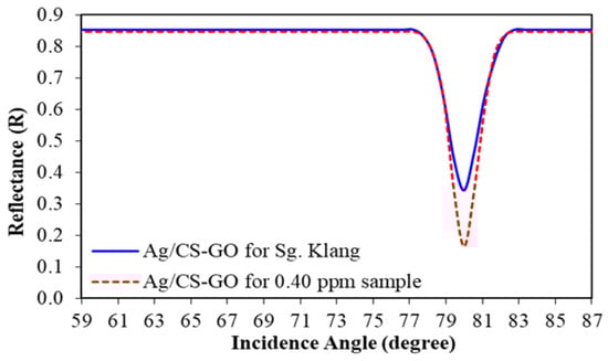 To study the SPR response for Pb(II) ion detection in the river, two types of samples were prepared: standard Pb(II) ion solution and real water samples collected from the rivers. According to the SPR analysis in Figure 9, SPR shows better sensor response when using Ag/CS-GO and Ag/CS-GO-Ionophore thin films for the detection of Pb(II) compared to that of an Ag/CS thin film. However, Ag/CS-GO and Ag/CS-GO-Ionophore show almost similar performances toward Pb(II) ion detection. Therefore, in this section, only an Ag/CS-GO thin film was used throughout the study. Figure 12 shows the SPR curve of Pb(II) ion detection using an Ag/CS-GO thin film layer for standard Pb(II) ion solution at 0.40 ppm and real water samples collected from the Klang river. The graph shows that the incidence angle is at 80.00° for the Ag/CS-GO thin film when exposed to the 0.40 ppm standard Pb(II) solution and real water sample, which is closely matched with the SPR curves in the previous section for the concentration ranging from 0.1 to 0.5 ppm (Figure 8b). The reflectance value obtained for the standard Pb(II) ion solution and real water samples are 0.1635 and 0.3420, respectively with the percentage difference of 52.19%.