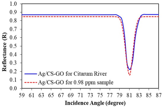Meanwhile, Figure 13 shows the SPR curve of Pb(II) ion detection using an Ag/CS-GO thin film layer for an 0.98 ppm standard Pb(II) solution and a real water sample collected from the Citarum river. The incidence angle is observed to appear at 81.111° for the Ag/CS-GO thin film when exposed to the 0.98 ppm concentration, which is in agreement with the SPR curve in the previous section for 1 ppm concentration (Figure 8b). The reflectance was calculated to be 0.163 and 0.271 for standard Pb(II) ion solution and real water samples, respectively, with a percentage difference of 39.78%. A smaller dip was observed for both SPR curves using a real water sample compared to that of standard Pb(II) ion solution due to the presence of interference in the real water sample, which affected the SPR response [41]. From these observations, it can be concluded that the SPR technique based on Ag/CS-GO nanostructure thin film is reliable for Pb(II) ion detection in real water samples.