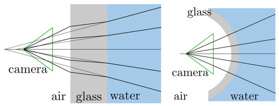 Underwater cameras mainly use two types of ports: flat or dome-shaped. At the expense of a more costly and difficult process of manufacture and assembly, dome ports can in principle reduce the refractive effect because there is a theoretical alignment between the interface normal and the incoming rays. However, due to small misalignments, this reduction is not usually total [51]. Performance comparisons of camera models and types of ports are done in [58,59]. Similarly, projected light also suffers this refraction process. For instance, Palomer et al. [57] demonstrated that an elliptic cone is a better geometry to describe the deformation of a laser line through a flat port in water than a plane, especially when the incidence angle between the laser and the port increases. Using an elliptic cone rather than a plane, however, makes the 3D reconstruction process more computationally demanding.