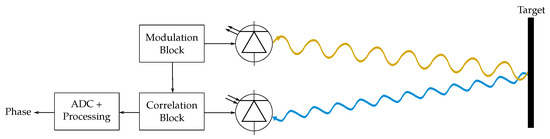 Most of the ToF sensors in the literature share a similar basic structure [71] (see Figure 5): a light source (transmitter), a matching detector (receiver), suitable circuitry to provide the needed power supply and control signals to transmitter and receiver, readout electronics and an analog–digital converter (ADC).