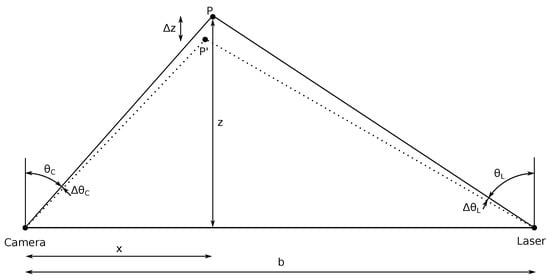 Designers of triangulation systems have to decide the geometrical configuration of its elements (regardless of them being a camera and a laser, a camera and a projector or two cameras) to comply with the requirements of depth resolution and maximum scanning range. In order to explain the concept of depth resolution geometrically, consider now that both the camera and the laser in Figure 6 are non-ideal and have finite angular resolution ( and , respectively). This entails that the observable FoV is discretized and measurements can only happen in the limited intersections of light rays coming out of the laser and sensed by the camera. Of all those intersections, the closest to P is . Their z coordinates differ by , which is the depth resolution of the device at point P. The relationship of depth resolution with scan distance, baseline, and angular resolutions is given by the following equation [92]: