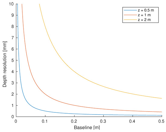 In order to express this relationship graphically, the x coordinate of point P is assumed to be halfway between the camera and the laser, which means that and . Moreover, the values of the angular relationships are assumed to be mrad. The resulting plot is depicted in Figure 7. The main conclusion is that both scanning at larger distances and using a shorter baseline influence negatively in the depth resolution.