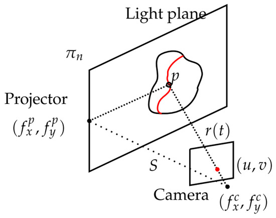 The equation of the laser plane is assumed to be known with respect to the camera coordinate frame and can be written as . The parametric equation of any point p of the line (see Figure 8) in the camera coordinate frame is