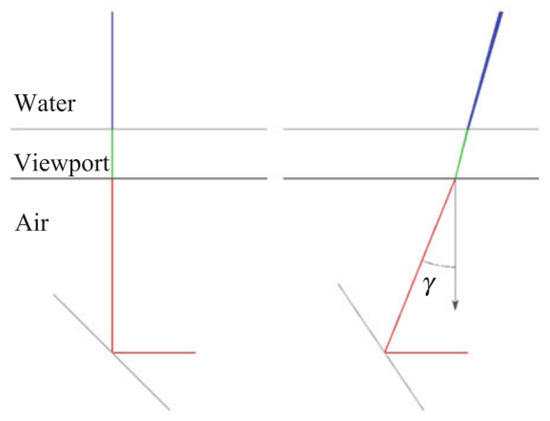 - In underwater triangulation sensors using flat viewports, the direction of light rays changes twice due to double refraction (see Figure 9), which can affect the accuracy of the reconstruction. At increasing incidence angles of the laser in the viewport, the laser plane transforms into an elliptic cone (see Figure 10), which makes the 3D reconstruction more computationally demanding [57].