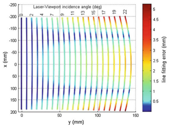 Figure 10. Projected laser lines are increasingly distorted for higher incidence angles of the laser in the viewport [57].
