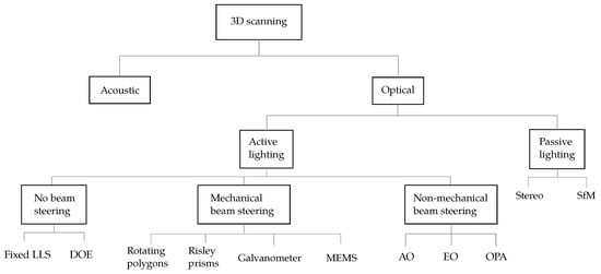 A big-picture classification of beam steering technologies is presented in Figure 11. First, active techniques that do not perform beam steering are explained in Section 4.1. Then, laser steering technologies are classified according to whether they involve mechanical elements or not. Both groups are explained in Section 4.2 and Section 4.3, respectively. Finally, a comparison is carried out in Section 4.4.