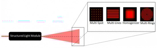 This section gathers two light projection techniques that do not use any type of beam-steering mechanism. On the one hand, the whole scene can be illuminated at once using a homogeneizer diffractive optical element (DOE) (see Figure 12). This technique needs a 2D ToF sensor in order to resolve the 3D position of the scanned scene [75,76]. This is considered an active method because, even though the light direction is not actively controlled, its time structure provides information for the 3D reconstruction. A variation was introduced by Massot-Campos and Oliver-Codina [60], who used a special doe to project a pattern of lines and resolved their 3D position by triangulation. Acquiring the whole scene at once has the advantage of being robust against the high dynamics of the scanned scene and against the sensor movement. However, it usually comes at the cost of reducing lateral resolution.