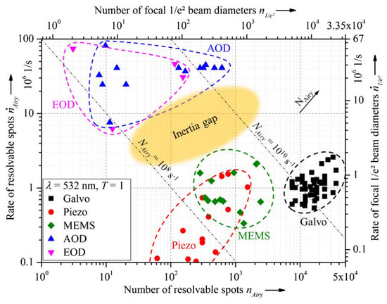 - Bechtold, P.; Hohenstein, R.; Schmidt, M. Evaluation of disparate laser beam deflection technologies by means of number and rate of resolvable spots. Opt. Lett. 2013, 38, 2934. [Google Scholar] [CrossRef]