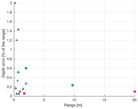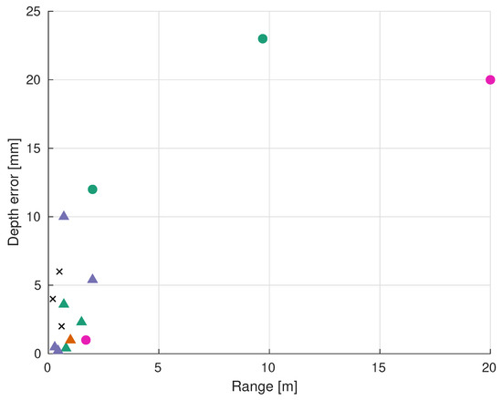 The main difference in performance between ToF and triangulation sensors concerns scan range and depth resolution. The depth resolution of a ToF scanner depends on the resolution of the time or phase measurement but not on the scan distance, unlike for triangulation scanners. This fact was studied by McLeod et al. [96], who identified a threshold of ranges (<1 m) where triangulation-based sensors provided higher depth accuracy. Above 2.5 m, ToF sensors were generally more accurate.