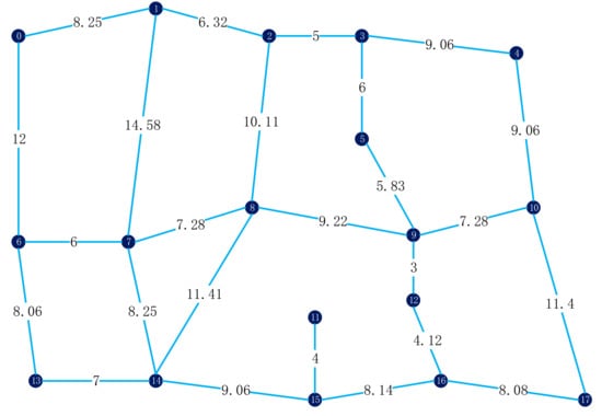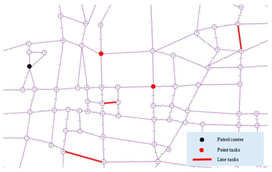 In the above directed graph of the road network, we define as the patrol center, which serves as the start and end points of the patrol. The point task is expressed as , for . In addition to , , for , and . Similarly, the line task is expressed as , for , and , for and . In addition, .