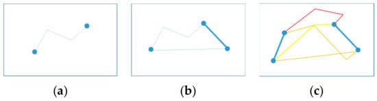 The closed-loop approach to the multiple tasks in urban roads is essentially connecting the tasks in sequence with the lowest cost. Since there are certain differences between point tasks and line tasks, line tasks can be understood as two adjacent point tasks that must be accessed continuously. Patrolling requires entering the road at one of the endpoints and completing the patrol at the other endpoint. Clearly, for heterogeneous tasks in urban road networks, there are three ways to connect tasks in the network (as shown in Figure 2).