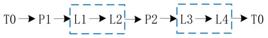 Based on the auxiliary decision variables set in Section 3.3.1, we set depending on whether the sortie of the drone takes off from and lands in , , , and . We define the set of points through which the drone takes off and lands as , for . Let be the flight of the drone, from to , for ,. For the access path of the drone, there are the following constraints: