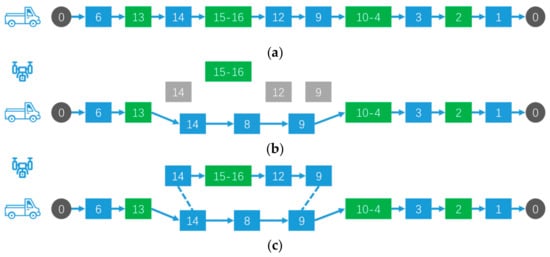 In the first stage, all tasks are assigned to the vehicle, which results in an optimal traversal path. In this section, a heuristic strategy is designed for drone task assignment optimization. Based on the first stage, a complete assignment strategy is finally formed by continuously extracting tasks, redistributing these tasks to the drone and then evaluating the effectiveness. Figure 4 graphically illustrates the heuristic strategy process. The green squares represent task nodes, and the blue squares represent non-task road network nodes.