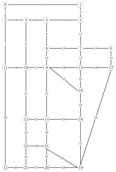 The Sioux Falls network [44] was used for the numerical experiments. The Sioux Falls network consists of 24 nodes and 38 segments, as shown in Figure 5. The length of each segment is listed in Table 5. Points and line segments have separate labels. For example, the length of line 5 is 4, which means that the distance from point 4 to point 5 in Figure 5 is 4. We assume that both the vehicle and the drone are moving at a uniform speed, and we tested various combinations of heterogeneous tasks, including point tasks and line tasks with different numbers and locations.