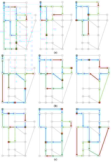 Process of the heuristic strategy of drone task assignment optimization. (a): Vehicle traversal path in stage 1, (b): Task trial assignment and vehicle path reoptimization, (c): Determination of the take-off and landing points and path planning of the drone.