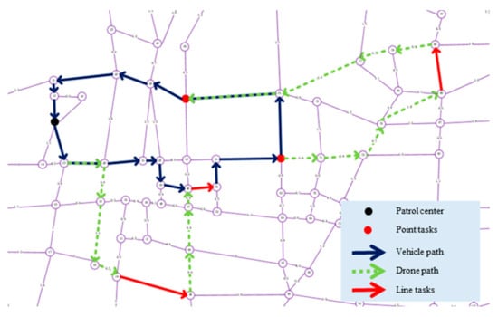 With the rapid growth of urban vehicle ownership [1], road traffic congestion has become a hotly debated public concern, and traffic management departments can effectively alleviate traffic congestion by deploying patrol vehicles to patrol different road sections [2]. However, when roads are heavily congested, it is difficult for patrol vehicles to enter the congested roads to disperse traffic [3]. In recent years, as a new type of flight platform, drones [4,5] have been used, with the characteristics of being low cost and having a low weight, high mobility and great adaptability to carrying different types of loads [6]. Drones can cooperate with ground vehicles to complete multiple traffic patrolling tasks [7,8,9] and have gradually become effective vehicles for traffic patrolling tasks [10]. For example, both the Seattle and Los Angeles police departments have made drone patrols part of their law enforcement activities; in 2016, the Nanjing Yangtze River road administration brigade manually operated drones to conduct road patrolling and traffic monitoring tasks during holidays, and in 2017, the Devon, Cornwall, and Dorset police forces jointly established the UK’s first dedicated drone force to provide corresponding police services. Therefore, the patrol for traffic monitoring [11] and incident response can use drones to enhance efficiency [12]. However, most of the drones available for patrolling tasks are rotary-wing drones, which have a limited endurance. A direct solution is to use a vehicle to provide assistance [13]. The vehicle transports the drone and performs traffic patrols through the release and recovery of the drone, while the vehicle also performs mission visits. This method takes full advantage not only of the long-distance driving ability of vehicles but also of the high mobility and wireless remote-control aspects of drones [14]. However, this also creates a new problem, which is how to cooperate between a drone and a vehicle during the patrol tasks. Moreover, the collaborative access strategy and route selection of vehicles and drones is a complex optimization problem, and there are still many challenges in the path planning of vehicles and drones.