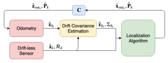 Notice that the proposed algorithm only estimates the covariance of the odometry output but does not correct such drift. The correction can be done through using the output of the localization algorithm as shown in the following equations and illustrated in Figure 1.