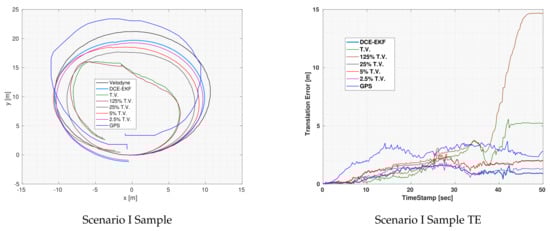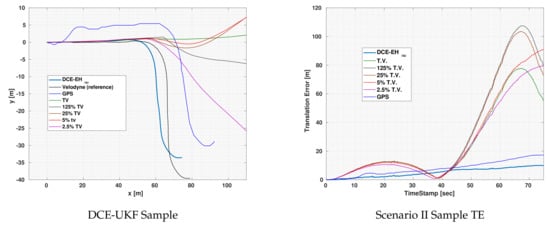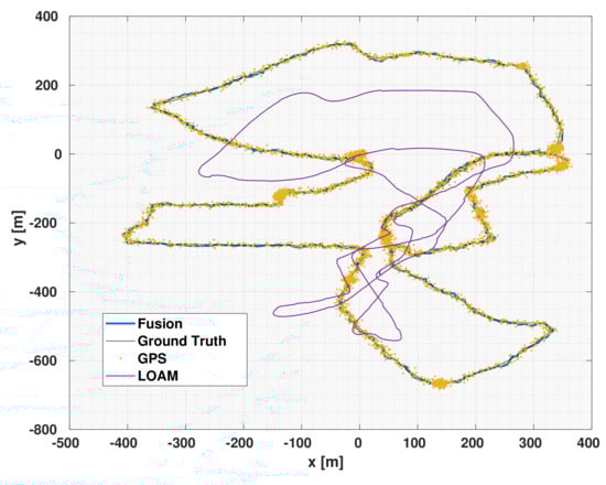Due to the high amount of drift error in the LOAM results, as shown in Figure 6, one might think that the results of only using a UKF to filter the readings from the GPS might lead to a better results than fusing the GPS with a LiDAR odometry and using the DCE algorithm. For this, we also show the results of filtered GPS readings using a UKF without fusing the results of the LOAM at all. As it can be seen in Table 15, the result of fusing DCE-LOAM with the noisy GPS readings led to better results than ignoring the data from the LOAM completely.