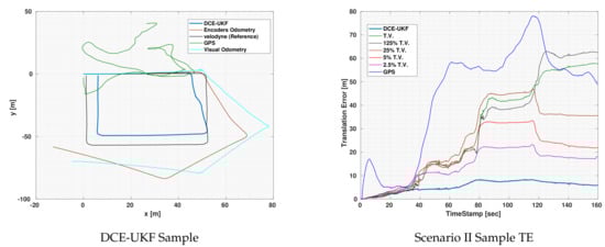 Table 14 shows the results of the DCE-UKF algorithm compared with different constant covariance similar to the results shown in the previous two subsections. As shown in the table, the results of the DCE-UKF outperform those of the UKF with constant covariances. Those results for the LiDAR odometry (LOAM) conform with the findings of the previous two subsections which shows the results of the DCE algorithm for visual odometry (Oxford Dataset), and visual and encoder odometries (iCab experiments). Although the results of the DCE-UKF compared to constant covariance shows the efficacy of the DCE algorithm, the aim of this subsection and the validation with EU Long-term Dataset is to show the effect of the DCE algorithm when integrated with the LOAM and show the fact that DCE can be integrated with any odometry algorithm in order to estimate its drift covariance and consequently achieve more accurate pose estimation through multisensor fusion.