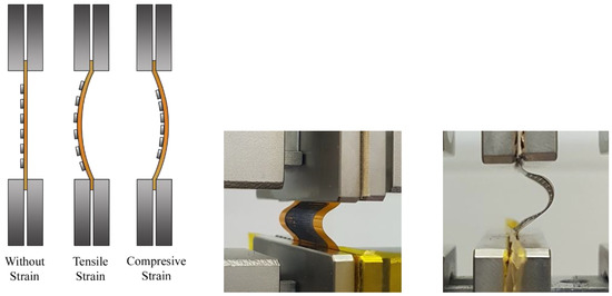 For the bending test, an AGS-X 10 kN Shimadzu universal testing machine was used. The sample was carefully gripped by its ends to avoid damaging it and ensuring that it remained perfectly aligned with the center of the grips. The machine was programmed in compression mode, i.e., the upper crosshead went down a controlled vertical displacement, or stroke (ΔL), and returned up to complete a cycle. During this cycle, the compression force was exerted, and the sample buckled achieving a maximum deflection (f). The parameters measured in this test were the electrical resistance, the stroke (ΔL), and the force applied (F). Trapezium X Materials Testing software was used to acquire the stroke and force parameters. Simultaneously, an external data acquisition switch unit (34972A Keysight, Santa Rosa, CA, USA) was used to measure the instantaneous electrical resistance of the active layer. One sensor was tested at a time. Depending on the shape of the buckling deflection, the active electrode would be subjected to tensile strain (and stress) or to compressive strain (and stress). Figure 3 depicts the sensor in flat mode under tensile strain and compressive strain.