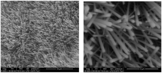 Prior to the sensing tests and bending cycles, a sample of each set of sensors was inspected to validate the growth of WO3 NWs. An environmental scanning electron microscope (E-SEM, FEI QUANTA600, Hillsboro, OR, USA) was employed to examine the structure of the WO3 NWs. Images revealed a layer of non-aligned nanowires (Figure 4). Pristine and Pd-decorated WO3 NW were successfully grown over the sensing area, connecting electrodes and heaters. Tungsten oxide NW oxidation was incomplete due to the low annealing temperature used to avoid damaging the polymeric substrate. More complete oxidation has been reported at higher temperatures [16]. XRD reveals that both pristine and Pd-loaded tungsten oxide are monoclinic, which is in full agreement with previous results achieved using this growth technique on rigid substrates [16,18].