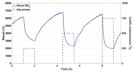 Sensors with pristine WO3 NWs over Ag electrodes were subjected to gas tests for two days. As described above, a continuous flow of synthetic dry air was kept, and different concentrations of H2 (250, 500, and 750 ppm) were repeatedly injected. Figure 5 shows a typical measurement of the variation suffered by the resistance (Rsens, i.e., applied Vsens divided by measured Isens) of one of such devices for a complete exposure and recovery cycle of three hydrogen concentrations.