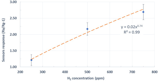 Average response (Rair/Rgas-1) toward different hydrogen concentrations of Pd-decorated WO3 sensors that employed gold inkjet-printed electrodes.