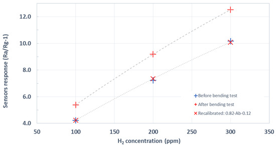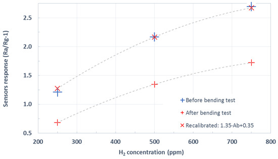 Sensors were bent cyclically 50 times to a curvature radius of 3.7 mm. The electrical resistance of the active layer was continuously measured while bending. It increased and decreased accordingly to the stroke value applied, as expected (see Figure A1). From this figure, it is clear that the resistance of the active layer suffered a small increment after each bending cycle. Figure A2 summarizes such accumulated resistance increase. At the end of the tests, the electrical resistance of the active layers almost recovered their starting value (the increase in the electrical resistance was lower than 2.3%). An optical inspection showed no appreciable damage to the devices. Both facts indicate that these devices had withstood the mechanical stress. Therefore, they would remain operational after repeated bending. Figure 7 summarizes the results of hydrogen measurement after the bending tests. This figure compares the previously calculated calibration curve (shown in Figure 6) to the resulting one after bending. As can be observed, the shape remains almost identical, up to the point that sensor response can be recalibrated by means of a simple linear adjustment to fit the pre-bending response. The sensitivity (i.e., the slope of the calibration curves shown in Figure 7) toward the hydrogen of pristine WO3 NWs over Ag-stenciled transducers showed a reduction by a factor of 1.35 after the bending exercise.