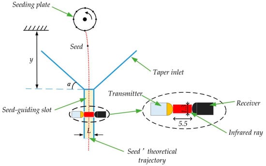 Substituting the value of y into Equation (2), a seed’s falling time from when it was discharged from the seeding plate until falling into the guiding slot was determined, which was approximately 0.09 s. Moreover, the installation distance in the X-direction between the middle point of the seed guiding slot and discharging point was 5.67 mm, which was calculated using Equation (1). To avoid a choking phenomenon, the length of guiding slot L should be larger than the largest diameter (2.14 mm) of the seeds. However, if the distance between the transmitter and receiver was more than 5.5 mm, the receiver may not receive the infrared ray steadily. Therefore, the range of L was determined to be between 3 to 5.5 mm.