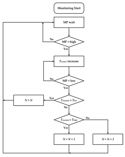 As previously mentioned in Section 2.3, the signal processing circuit would output a high-level impulse when the infrared ray was shaded by a falling seed. If the monitoring pin (MP) of the MCU detected a rising edge, a pulse-width timer would start to count the sustaining time Tsustain of the high-level. The Tsustain would continuously increase until the MP detected a falling edge.