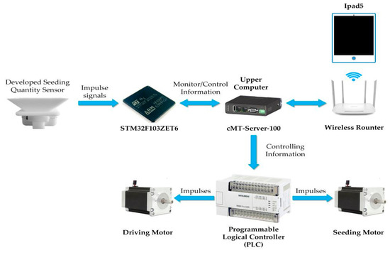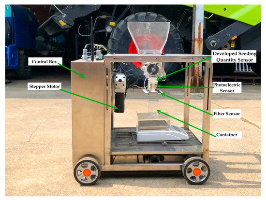 Further, a programmable logical controller (PLC) (FX-1N, Mitsubishi Electric Corporation, Tokyo, Japan) connected to the upper computer was applied to control the forward speed of the experimental apparatus and the rotational speed of the seeding plate. Furthermore, a router (TL-WDR5620, TP-Link Technologies Co., Ltd., Shenzhen, China) was applied to transmit the detection information to the HMI using a wireless signal and receive the commands from the HMI to control the PLC. In addition, a container was placed under the sensors to catch the discharged seeds. After each experiment, the actual seed number was counted manually.