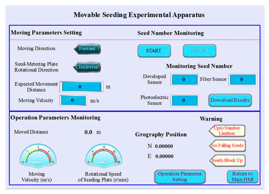 An experimental apparatus (Figure 6) for seeding performance monitoring was applied. It could conduct seeding performance monitoring experiments in a mobile state. The movable experimental apparatus was composed of a hopper, a controlling box, a seed-metering device, two stepper motors, four driving wheels, and aluminum alloy frames. In addition, a human–machine interface (HMI) (Figure 7) was developed as an application software installed on a tablet computer (Ipad5, Apple Inc., Cupertino, CA, USA).