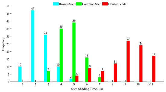 The frequencies of the seed-shading time under three experimental conditions are shown in Figure 9. In this figure, the frequency indicates the number of times a seed-shading time occurred under each seed volume condition (e.g., the number 47 denotes there were 47 times when the seed-shading-time was in between 1 to 2 μs under the broken seed falling condition). According to the results in Figure 9, 88% of the broken seeds’ shading times was less than 4 μs, and 86% of the double seeds shaded the infrared ray for more than 6 μs; thus, the Tlow and Thigh were set to 4 and 6 μs, respectively.