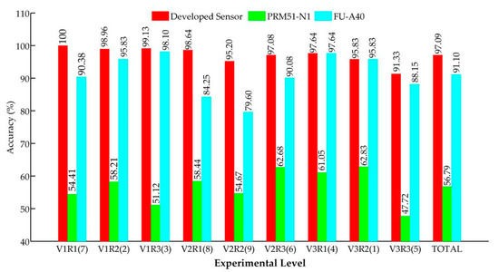 Figure 12 shows the average accuracies detected by the three sensors for all experimental levels. If the total accuracies in all experiment levels were viewed as a whole data set, the average accuracies of the three sensors were calculated and are shown by the last group of bars.