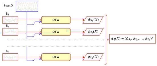 The mapping (6) provides an R dimensional vector without correspondence to dimensionality of original time series, therefore it is used in the further construction of a kernel able to work with time-series having, originally, different length. Although DTW must be computed R times, by keeping the computational cost is low due to the reduced length of each , more specifically. Indeed, the cost for computing , in the worst case, is . Moreover, parallel computing can be used to further improve efficiency, since the computation of each component of the vector is embarrassingly parallel, as depicted in the following figure, where we assume, for sake of simplicity, to have R different processors available.