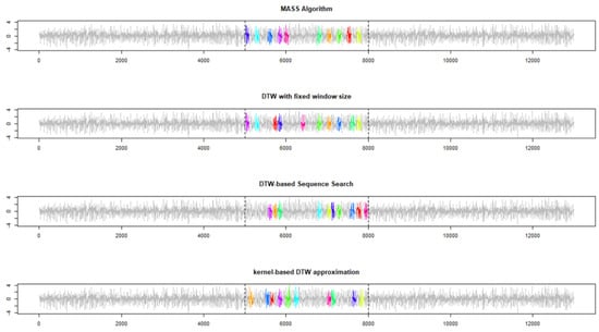 - MASS []: a fast similarity search algorithm for subsequences under Euclidean distance and correlation coefficient (experiments refer to MASS under Euclidean distance, only). A strong assumption of MASS is that the identified subsequences have the same length of the reference.