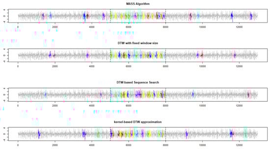 Of greater interest, when the number of repetitions to be found is increased from 10 to 25, the results provided by the four approaches are significantly different, as depicted in Figure 4. MASS and the DTW with fixed window size have identified, respectively, 9 and 6 subsequences outside the portion of data collected while the AIBO robot was walking on carpet. On the contrary, only four out of 25 subsequences identified by the DTW-based Subsequence Search (Algorithm 2) are outside the correct portion of data, and thus more effectively manage the temporal deformation between the subsequence and reference pattern by this algorithm, generate a more accurate identification. The proposed kernel-based DTW approximation results in a higher number of errors than DTW-based subsequence search (i.e., 8 subsequences outside the correct portion of data), that is, lower than MASS and comparable to DTW with fixed windows. Errors are due to the approximating nature of the approach but are counterbalanced by the significant reduction in computational time.
