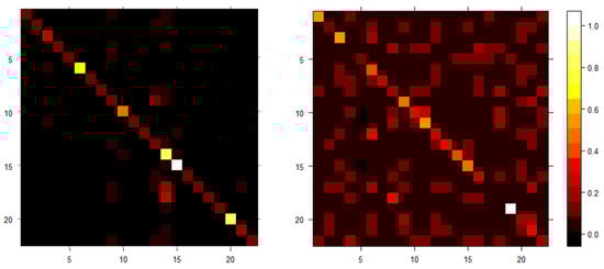 According to Experiment 1, the DTW-based subsequence search and kernel-based DTW approximations were more effective in identifying those subsequences, which are similar in shape to the reference. Therefore, we have decided to focus Experiment 2 on these approaches. The main differences with Experiment 1 are that, in this case, data streams are multivariate and 22 different references and data streams are considered. Thus, this experiment is devoted to validate the extension of the proposed approach to the multi-references case, summarized in Algorithm 3. The task consists in identifying, for each pair “reference–data stream”, the number of matching subsequences whose distance from the specific reference is lower than a given threshold. We named these repetitions “coherent repetitions”. Algorithm 2 was applied in two different ways: (a) directly on the multivariate data and (b) on each dimension of the data streams, separately (univariate approach). The sum of the coherent repetitions over the dimensions provides a measure on the quality of the matching between the given reference and data stream. The kernel-based DTW approximation algorithm was applied on the multivariate data streams, only. Figure 5 summarizes the confidence levels between each pair of reference pattern and data stream, respectively for DTW-based sequence search (on the left) and kernel-based DTW approximation (on the right), where each row of the matrix is associated to a reference and each column is associated to the data stream where the reference belongs to. The confidence level is computed as the number of repetitions of the reference within the data stream, in the case of DTW-based subsequence search, and values of the kernel-based distance in the case of the proposed approach. As both represent the same measure of confidence level, we simply rescaled it into ; more precisely, in the case of the DTW-based subsequence search, from every entry of the matrix, the minimum value on the corresponding row was subtracted, and then the result were divided by the difference between maximum and minimum values on that row. As the kernel-based DTW approximation is by definition in , it does not require any further rescaling.