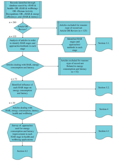 After the collection stage, the types of data which were not articles or reviews were excluded from the database. The next step was HAR stage identification and for each stage a summary of approaches were selected (Section 3.1). Additional paper selection was conducted in order to extract articles that dealt with energy consumption and latency in HAR. After the selection of articles, the authors explored the influence of the HAR stages on energy consumption and latency (Section 3.2). The next stage included the segregation of health and wellbeing applications where HAR was implemented across the literature collected, as well as the identification of approaches for energy consumption and latency reduction (Section 4). The next step was the survey of possible improvements for energy consumption and latency of HAR applications (Section 4.1) and the proposal of overall directions for the effective implementation of HAR in health and wellbeing applications (Section 4.2).