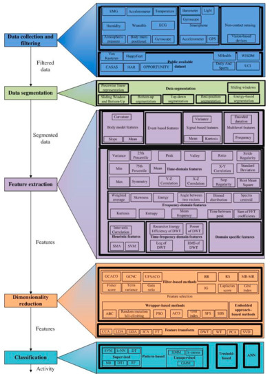 The first stage of HAR is data collection and filtering. The data collection process begins by defining a set of activities to be recognized, and then recording data from the sensors during a defined activity set [16], or simply taking over data from a publicly available HAR dataset [17].
