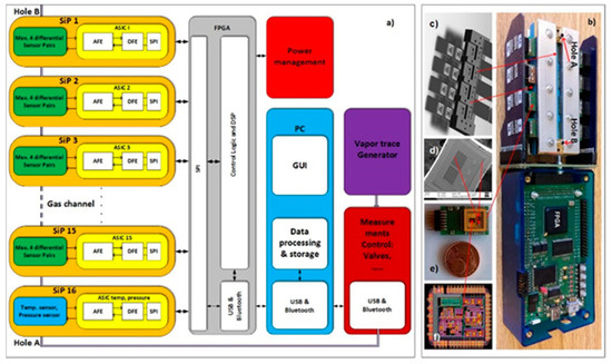 A block diagram of the 16-channel e-nose demonstrator for vapour-trace detection is presented in Figure 1a. It is composed of 16 differently modified comb capacitive sensors connected to an ASIC with detection electronics. One channel of detection electronics can serve a maximum of four differential sensors. In this experiment we used only two sensors in one channel of electronics. The result of the capacitance-difference measurement of each sensor is A/D converted and further processed in the FPGA [2]. The last, 16th channel serves for the temperature and humidity measurements. The results are sent to a PC for further processing, storage, eventual display and further signal processing using the methods of machine learning, as described here. The physical implementation of the 16-channel e-nose demonstrator is presented in Figure 1b, while its building blocks are presented in Figure 1c,d. The technical details of the demonstrator are explained in the references [2,20,21].