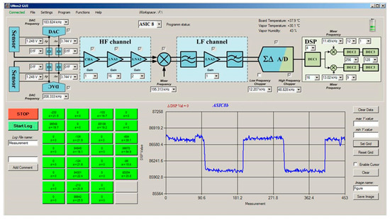 Figure 2 shows a PC interface screen of the 16-channel e-nose demonstrator, where the response of each sensor can be plotted vs. time at a rate of 100 points/minute. At the same time, each sensor’s response is analysed and plotted as a coloured square with a colour corresponding to the magnitude of the response. In this way a matrix of coloured squares is presented, as shown on the bottom-left part of Figure 2, which is helpful for monitoring and comparing the responses of different sensors. In the figure all the squares are green because no thresholds for the measured signal have been defined.