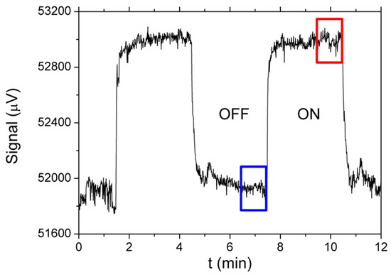 When the target sample-containing gas is introduced into the chamber where the sensor is located, the signal increases to a steady value, which we call the “on” state. When the valve with the sample-containing gas is closed and only pure nitrogen gas flows over the sensor again, the signal returns to the signal value in the “off” state. The signal value in the “off” state is subjected to long-term drifts within the time window of the experiment and has to be set before the measurement begins. Therefore, at the beginning of the measurements we manually adjust this “off” signal within the dynamic range of the detecting electronics to prevent saturation effects when the drift drives the signal to the limits of the electronics.