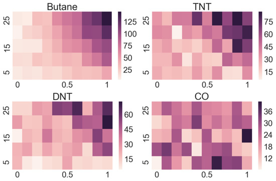 Looking at the heatmaps for the individual sensor responses when varying the concentration and flow of the target substance can give us a quick insight into which sensors are appropriate for the detection of particular substances and which ones do not respond. However, as the output of a multi-sensor e-nose is complex, meaning that some sensors respond to several substances and many sensors respond to a particular substance, a manual interpretation is practically impossible.