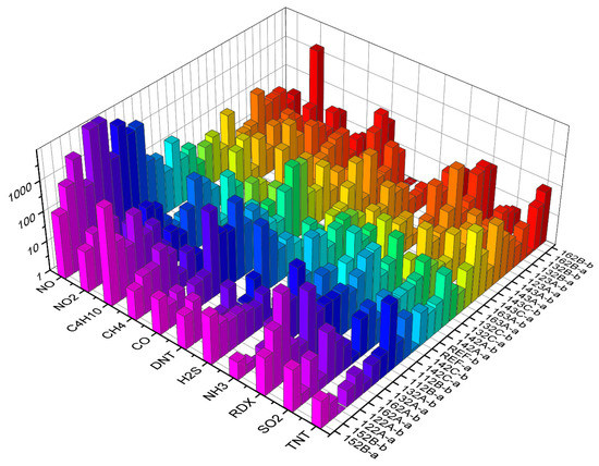 Building classification algorithms can provide an insight into which sets of substances can be distinguished well among themselves, as demonstrated in Table 2, Table 3 and Table 4. In addition, models based on decision trees are easy to interpret, allowing us to see which features are more important and which are not—if features related to a particular sensor do not appear in decision trees, the sensor can be discarded altogether when optimizing the sensor array for a particular application. For example, in the case where we distinguish explosives from other substances, an inspection of some decision trees generated by the algorithm shows that sensors REF-B, 143C-a and 132A-b play the most prominent role in the classification (they appear at the initial nodes of several trees). Looking at the responses of all the sensors to all the substances at the maximum concentration and flow (Figure 6), this is reasonable, since these sensors respond to TNT, DNT and RDX better than to some other substances.