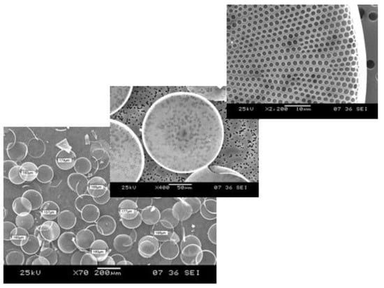 Sometimes the term biosensor is improperly used to describe a molecular system that detects a physical or chemical interaction between a probe and its target analyte, such as the antibody (the probe) antigen (the target analyte) couple. A biosensor is instead a working device that must give a numerical value when used to selectively quantify the amount of the target analyte in a complex mixture, just like any other commercial sensor used in the industry or everyday life [1]. A biosensor is made of a transducer element, the true sensitive part of the device, and a receptor that interacts with the target analyte. The advent of nanostructured materials as high-quality transducer supports has strongly improved the performance of biosensors, thus increasing the interest of the academic and industrial world. Among several nanostructured materials engineered in the research laboratories, the porous ones have been deeply investigated since they offered a specific feature with respect to their bulk or planar counterparts and, that is, a huge specific surface, available to sense the molecular probe-target interaction. This is the case, for example, of the porous silicon which is the nanostructured analog of crystalline silicon [2,3]. The porous silicon not only has a sponge-like morphology with a specific area that can be of hundreds of m2/g but it could also be photoluminescent. Porous silicon changes its physical properties on exposure to gases or liquids, whereas the crystalline silicon is almost inert and it cannot emit light [4]. Even if the nanostructured porous transducers show superior performances in sensing applications, they require specialized fabrication processes that could be expensive and complex. These are the main reasons why researchers considered some naturally-derived or biomimetic alternatives to man-made materials. Diatoms are microalgae diffused in marine and freshwater all over the planet, largely studied in biology concerning oxygen production and, also, as markers of environmental pollution [5]. Diatoms are constituted by a single cell enclosed in a nanostructured skeleton, called frustule, made of hydrogenated amorphous silica, which has dimensions ranging from few microns up to a millimeter. The frustule consists of two valves joined by girdle bands. The valves are pierced from side to side, as it shown in Figure 1 where images of the diatom Coscinodiscus wailesii by scanning electron microscope are reported. A very detailed description on diatom structure can be found in a paper of Losic et al. [6], where scanning electron microscopy and atomic force microscopy results are presented. From the biologic point of view, the frustule provides mechanical protection of the living cell, molecular sieving of nutrients, and light managing.