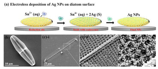 Schematic representation of Ag NPs’ growth on a diatom surface (a) FE-SEM top-view images of diatom (b) and in situ synthesized Ag NPs on diatom surface; (c) i–iii various magnifications of the NP-populated diatom. Reprinted with permission from [40]. Copyright 2019 American Chemical Society.