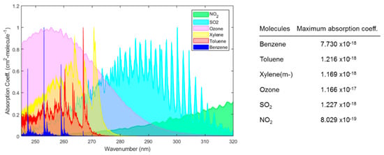 The ultraviolet (UV) absorption spectrum of different gases. The absorbance of each gas is normalized by the respective maximum absorption coefficient of the gas. The data of each molecule were obtained from HITRAN [] and then plotted on a wavelength scale.